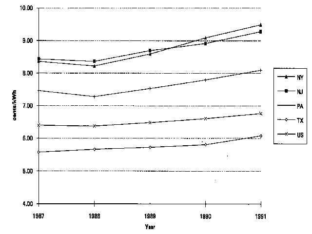 Figure 1, based on the most recent comparative data available from the U.S. Department of Energy, shows that from 1987 through 1991,the average price for electricity in New York, New Jersey, and Pennsylvania increased faster than the national average. In 1990, New Yorks average rate surpassed that of New Jersey. In 1992, the average electric rate charged by New Yorks utilities was 50 percent higher than the average rate nationwide, nine percent higher than the 1987 differential of 31 percent.