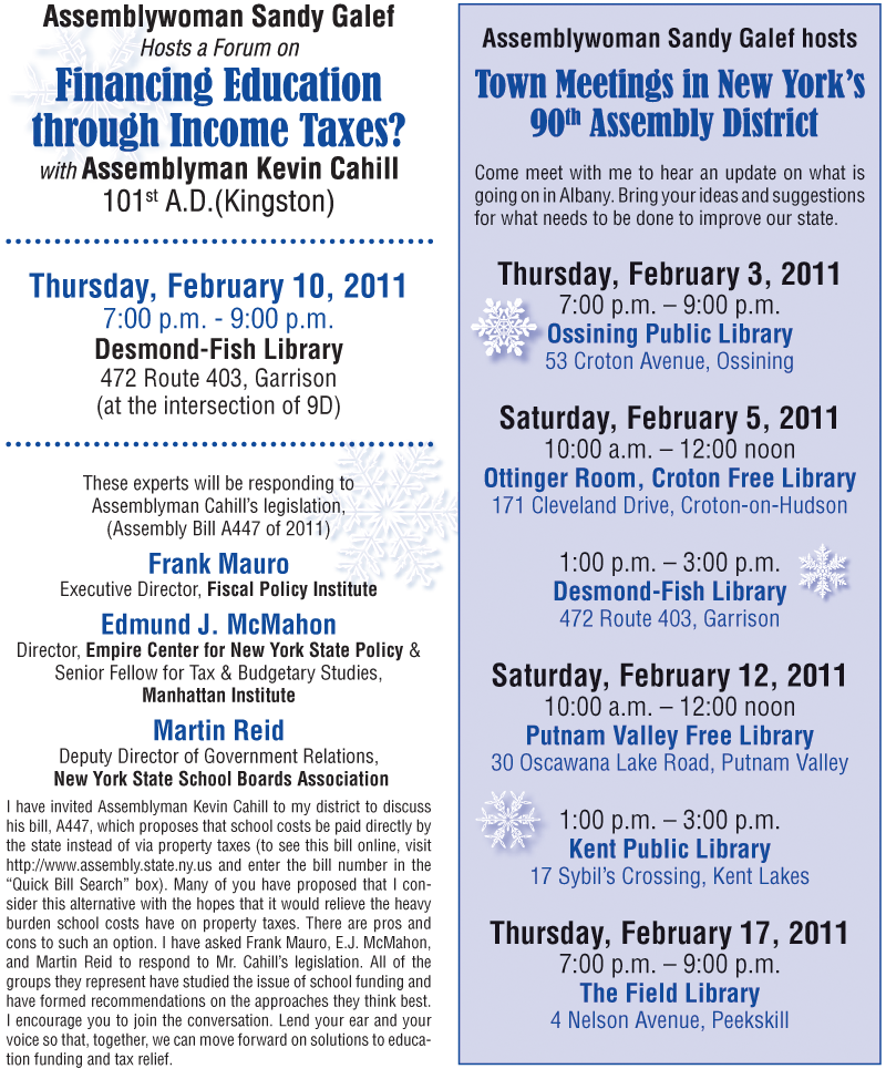 Our state dollars should be directed to where they are needed most. I continue to request your input and involvement which is vital to this process. I have a number of upcoming meetings which I invite you to attend so you can not only hear about such topics as alternate ways to fund schools, but also you can react to information and contribute your ideas. As always, I will be hosting town meetings around the 90th Assembly District to have an opportunity to meet and discuss a host of issues with you which I will be addressing through budgeting and legislation in Albany.