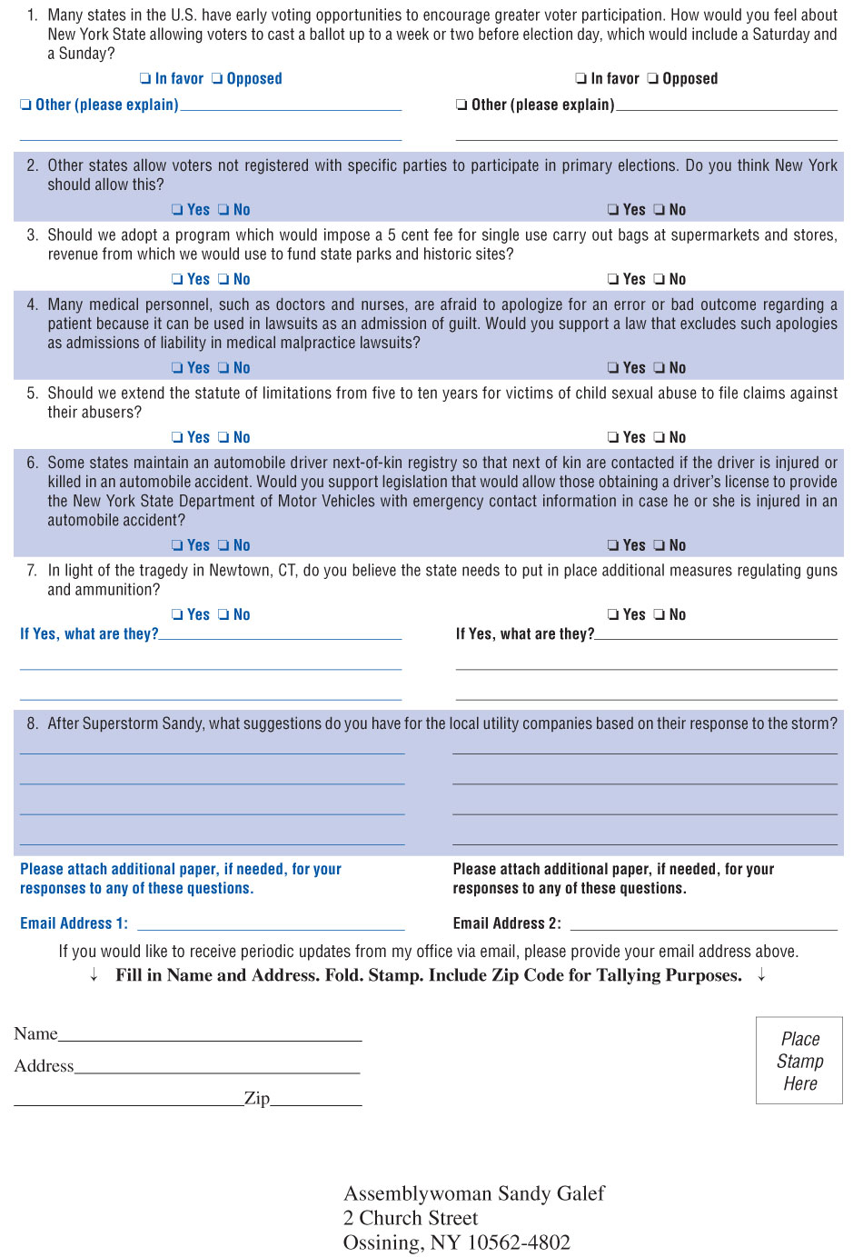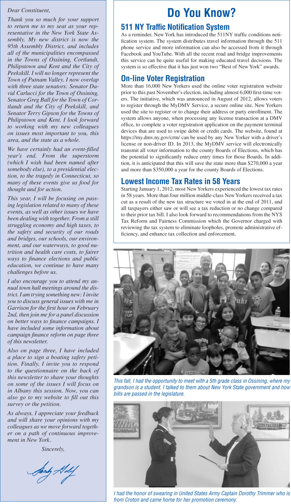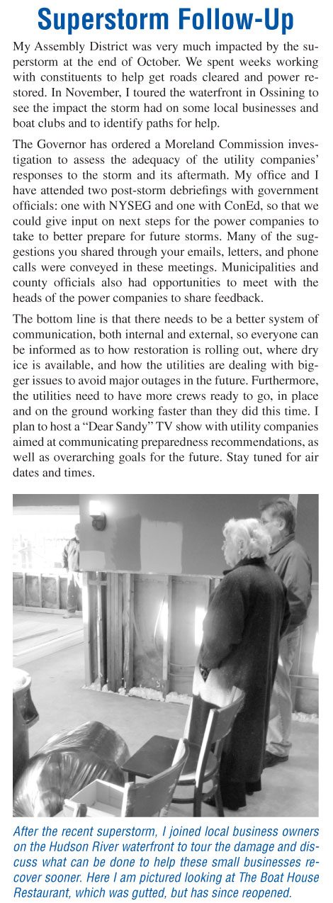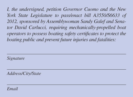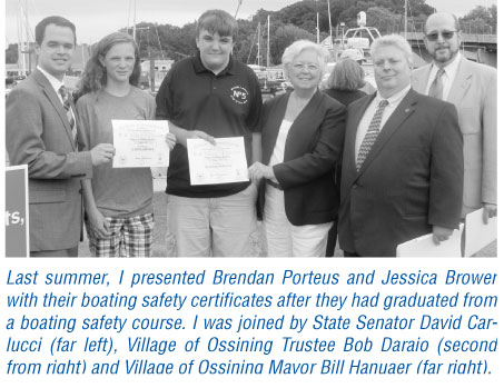 I have been building support for my boating safety legislation, which would require a person operating a mechanically-propelled vessel to have a boating safety certificate. This requirement would be enacted gradually, starting with those who are 18-years-old. If you would like to support this bill, please sign the petition I have started online by clicking here or sign your name on the line below, mail it back to my District Office, and I will add your name to my petition list. I hope 2013 will be the year New York State adopts a boating safety certificate requirement to reduce needless accidents from occurring on our waterways.
