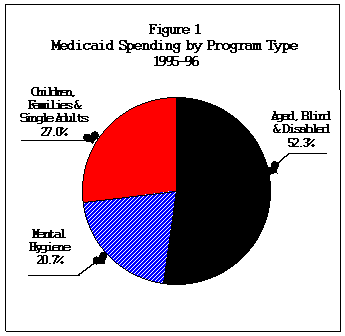 Medicaid services are provided to three major types of clients: the aged, blind, and disabled who require expensive long-term care in addition to other services; the mentally disabled; and children, families, and single adults in temporary need of assistance due to their financial circumstances (see Figure 1). Although the aged, blind and disabled account for about 67 percent of total program costs, they comprise less than one third of all Medicaid recipients. Over 40 percent of the more than two million people who received care through the Medicaid program on an average monthly basis during the 1995-96 fiscal year were dependent children although children account for only about 14 percent of program costs. The focus here will be on the two populations which comprise the “traditional” Medicaid population: the aged, blind and disabled; and those in need of assistance due to their financial circumstances.