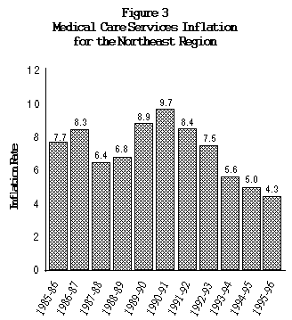 In response to the great fiscal pressure produced by these high rates of growth, New York, like many other states, initiated major efforts to contain costs. As a result, spending growth for the 1992-93 fiscal year fell below six percent and has not since returned to the high levels of spending growth which were common during the last recession (see Figure 2). Nor is it likely such high levels of spending will return in the present health care environment. The industry is experiencing significant restructuring, given the growing importance of managed care and the need to control costs. Change is being felt in every sector, impacting not just Medicaid but all aspects of health care. The extent of this change is clearly reflected in the decline in the growth of medical care prices which has been witnessed over the last few years. The medical services component of the Consumer Price Index for the Northeast Region has fallen steadily since peaking at 9.7 percent during the 1990-91 State fiscal year (see Figure 3). Medical price inflation fell below four percent during 1996 and is expected to average only 3.8 percent during SFY 1997-98.
