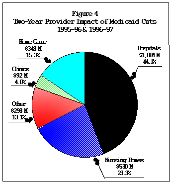 As Medicaid expenditures are shared by the federal, State, and local governments, the savings to the General Fund alone understates the total impact of the State's cost containment policies on health care providers. The General Fund savings of $650 million translates into a revenue loss to providers of $1,229 million. Similarly, the all payor impact of the $334 million in General Fund savings adopted in SFY 1996-97 was expected to be about $1,043 million. The distribution of the two-year impact by major provider type is presented in Figure 4. The effect of these efforts has been restrained growth in those sectors that have been targeted for control, namely hospital inpatient services, nursing homes, and long term home-based care.