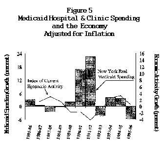 During the mid-1980’s, when the State economy was experiencing strong job growth, the rate of growth in Medicaid hospital and clinic spending declined significantly. When the economy weakened in the late 1980’s, spending began to rise again. The growth in spending peaked above 20 percent during the 1991-92 fiscal year. Since the end of 1992, the State economy has experienced moderate growth and State growth in Medicaid costs has declined. Modest economic growth is expected to continue through the current fiscal year and into the 1997-98 fiscal year as well. The resulting creation of new employment is expected to be a continued source of downward pressure on hospital inpatient services, as well as on outpatient services although to a lesser degree.