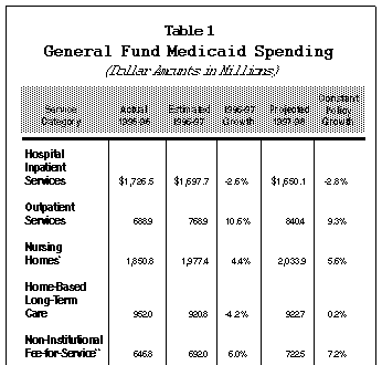 Carefully examining those critical factors that determine Medicaid spending allows us to project total spending for the next fiscal year. These factors include the rate of growth in medical costs, changes in demand for Medicaid services due to changes in the rate of job growth, the overall restructuring of the health care industry, as well as government policy actions. However, as the previous discussion makes clear, these factors do not operate uniformly on the various categories of Medicaid spending. For example, the shift away from institutional settings toward outpatient or home-based settings will tend to increase demand for hospital outpatient and home-based long-term care, at the expense of hospital inpatient and nursing home services. We therefore decompose total spending into five major components: hospital inpatient services, outpatient services, nursing homes, long-term home-based care, and non-institutional fee-for-service spending, in order to make projections.12 This enables us to properly assess the effects of the various forces that operate differentially on each area.13