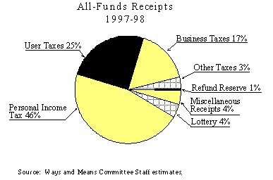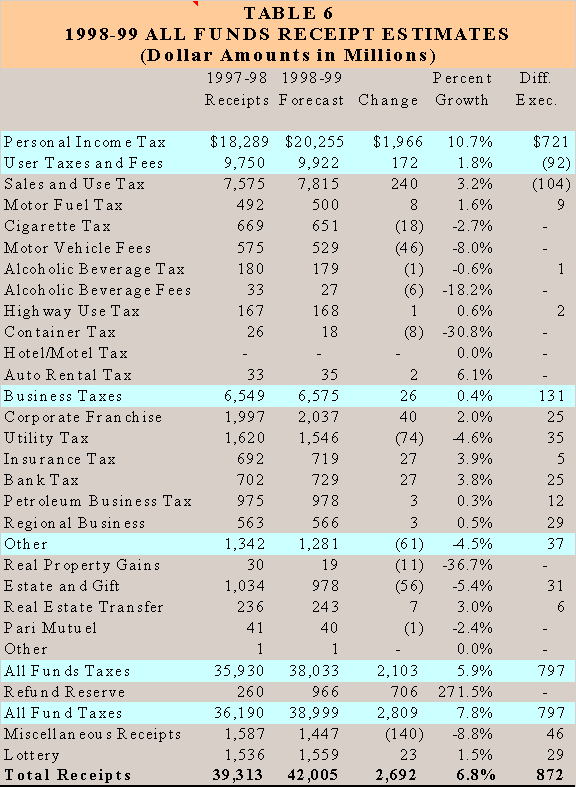 In State Fiscal Year 1998-99, the Committee Staff forecasts All Funds taxes to total $38,033 million, which is $2,103 million higher than State Fiscal Year 1997-98. However, Non-General Fund taxes are forecast to total $4,559 million, reflecting growth of 3.0 percent, or $133 million, over State Fiscal Year 1997-98. Total All Funds receipts are estimated to total $42,005 million, representing 6.8 percent growth.