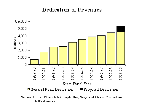 In addition to this $724 million in Personal Income Tax dedication in State Fiscal Year 1998-99, there is a dedication of $30 million from the Motor Vehicle Fees to pay for the proposed 25 percent reduction in vehicle registration fees, and an additional $17 million dedication from the Petroleum Business Tax to pay for previously enacted tax cuts, and to hold Special Revenue Funds harmless.