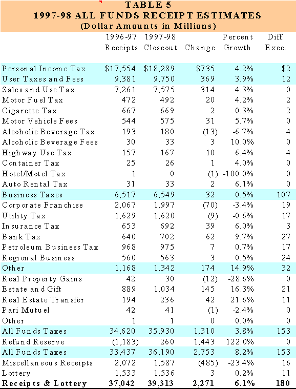 1997-98 tax receipts will grow by 6.1 percent, totaling $39,313 million.